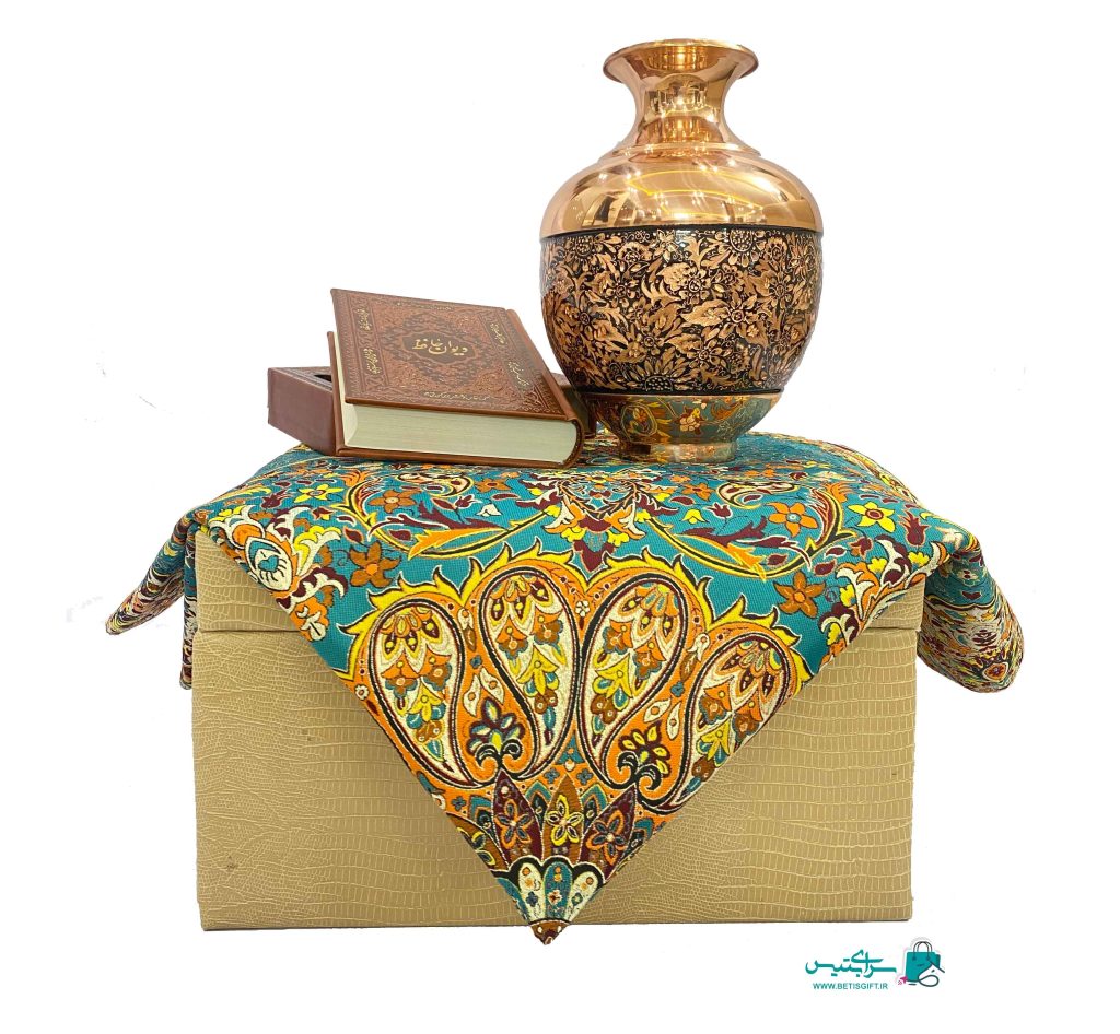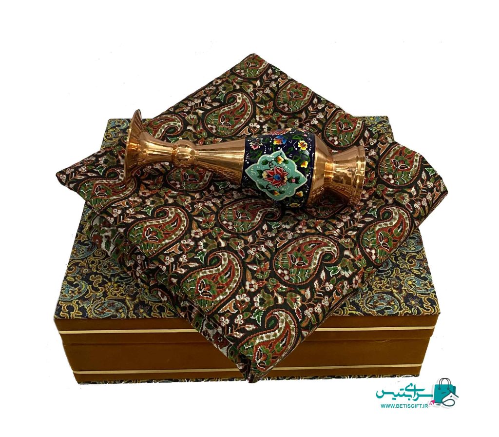 ست هدیه گلدان 20 مس و پرداز و رومیزی ترمه 1*1 به همراه جعبه هدیه ترمه