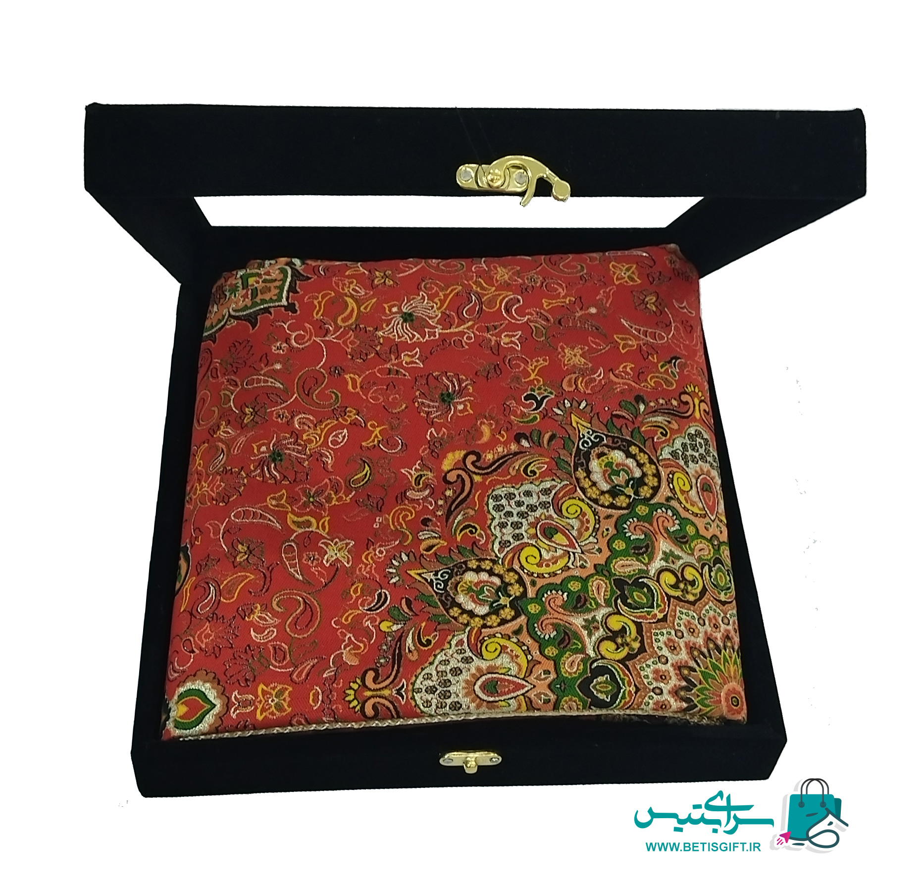 رومیزی ترمه یزدرنگ قرمز در جعبه هدیه جیر