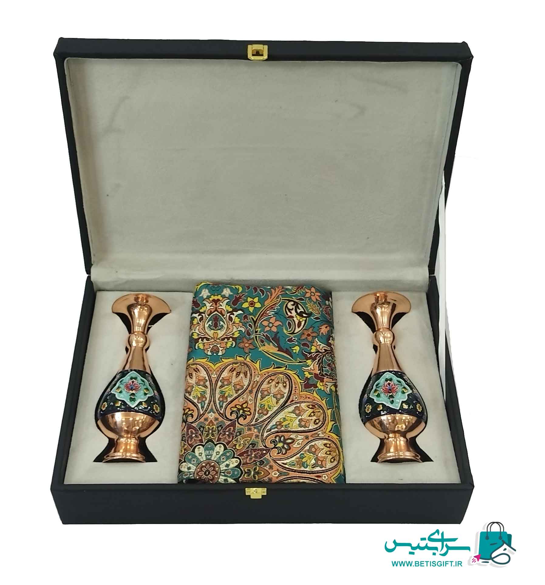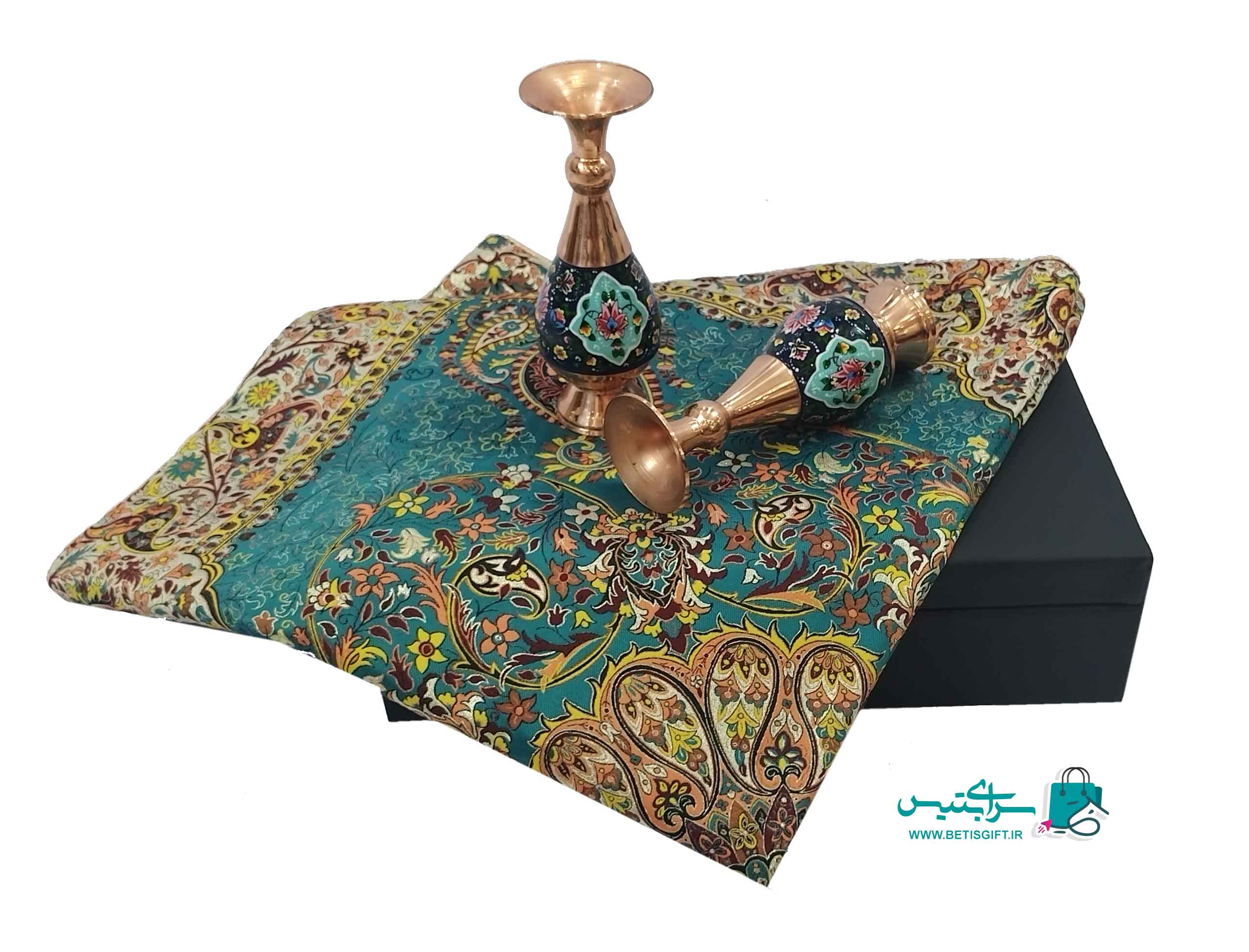 ست هدیه جفت گلدان 20 مس و پرداز و رومیزی ترمه به همراه جعبه هدیه